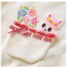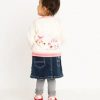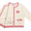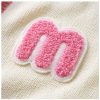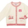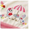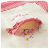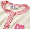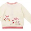 Đính len màu hồng ở tay cổ áo, tay áo, và lai áo kết hợp với nút áo hình bông hoa tạo điểm nhấn nổi bật