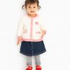 Đính len màu hồng ở tay cổ áo, tay áo, và lai áo kết hợp với nút áo hình bông hoa tạo điểm nhấn nổi bật